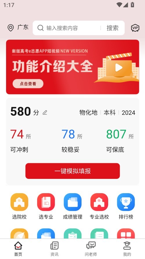 1、在本站高考e志愿平台,首页功能清晰直观,涵盖选院校、选专业、成绩管理、专业选校等板块,你可以在这里更全面地获取高考志愿相关信息。