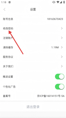 3、在设置页面,点击【修改密码】选项,进入修改密码页面。