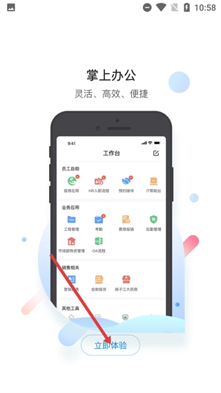 1、在掌上办公引导页,点击【立即体验】按钮,进入应用的后续操作流程。
