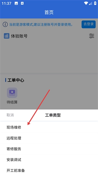 3、在工单类型选择界面,挑选目标工单类型(例如【现场维修】),随后进入新建工单的信息填写页面。