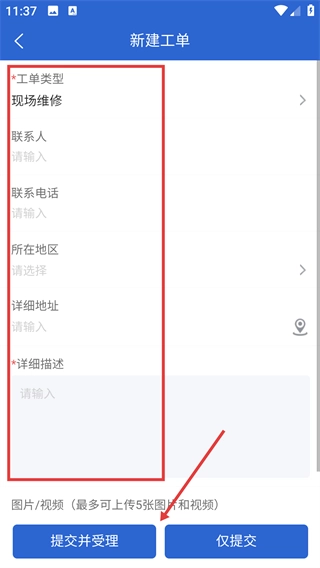 4、在新建工单页面,填写联系人、联系电话等必填信息以及详细描述后,可选择【提交并受理】或【仅提交】选项来完成工单的创建。
