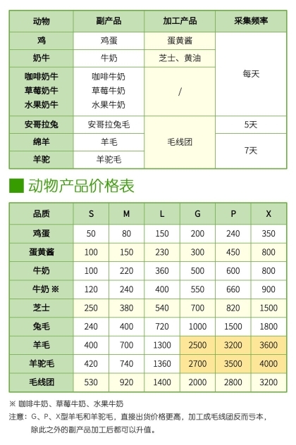 【 动物产品资料表与价格表】