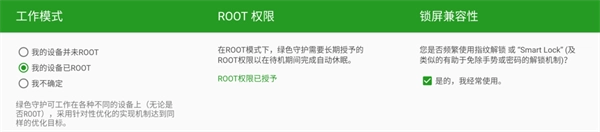 在设置向导中,想要获取的设备信息主要是两方面:是否已经 Root、是否具备指纹等手势和密码以外的解锁机制。前者决将定软件的工作模式,后者则不必多虑:这个年代的手机基本已经具备生物识别解锁的功能,选中「是的,我经常使用」框即可。