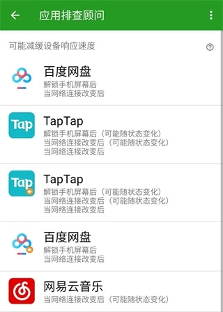 会排查正在后台运行中的应用,一般来说这类应用会消耗内存,在一定程度上还会使得设备运行变慢。如果你在这个列表发现你明明当前没有直接使用甚至是许久没有开启的应用, 可以考虑将其加入绿化列表。