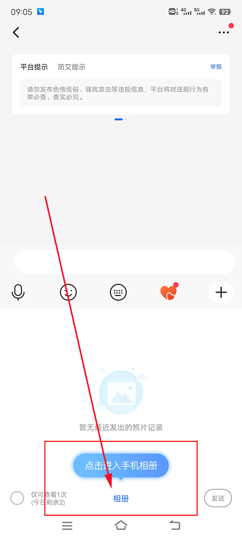 1、在聊天信息栏中,点击发送图片