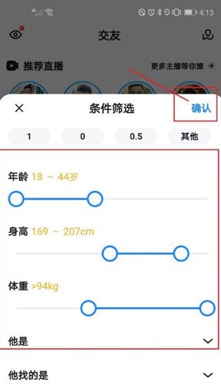 在条件筛选页面,能够依据特定条件来搜索用户,选好条件后,点击右上角的“确定”按钮,就能执行搜索操作。
