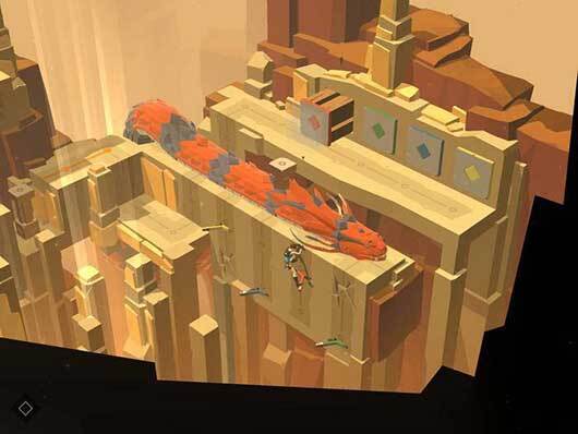 右侧画面里有不少带颜色的机关按钮,还有个能移动的立柱,稍微想想就知道,这立柱是通过当前场景的唯一工具。我们快速操控劳拉登上高台,把立柱拖到红色木桩机关的位置,接着跳下高台,借助下方的墙壁来躲开巨蟒的攻击。之后再次跳上高台,来到红色机关按钮旁边,在跳下去的那一刻,巨蟒会发起第二次攻击,这时候触发红色机关,就能把立柱推下去,刚好砸在巨蟒长长的身体上。巨蟒逃回洞里后,我们也就顺利通过这一关了。