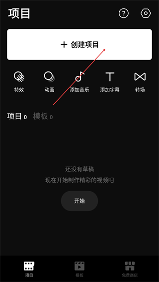 1、在“项目”页面点击【+创建项目】,进入素材选择界面。