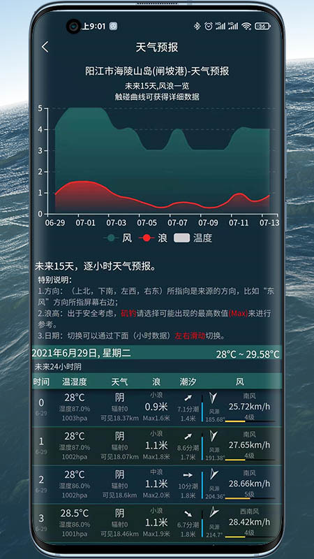 1. 潮汐预测:可查询未来24小时、48小时、72小时的潮汐时刻与水位预报。