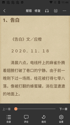 3.阅读界面支持文字大小和背景的更换,同时具备夜间模式与白天模式的自动调节功能。
