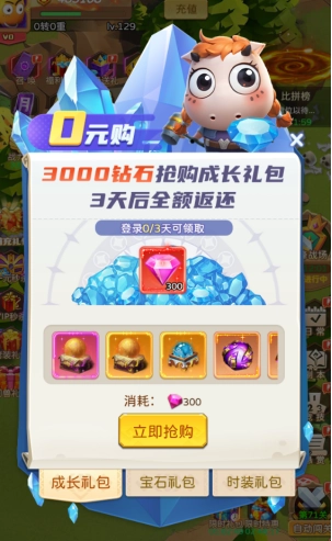 接下来就是人见人爱的【0元购】,凡是用钻石购买【0元购】礼包的您,都可以全额返还钻石,多买多返。