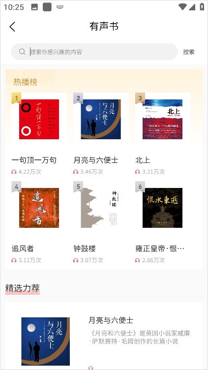 2、在有声书模块这里提供了非常多的书籍,咱们可以听取热播榜,也可以根据自己的需求搜索。