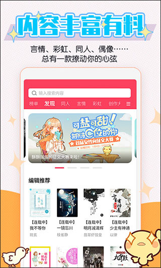 这款小说使用起来非常的方便,就算你是零基础,也可以在这里进行创作,不仅有小说,还有大量同人漫画,不管是电脑端还是手机端,都可以进行创作,而且全部都是同步更新。