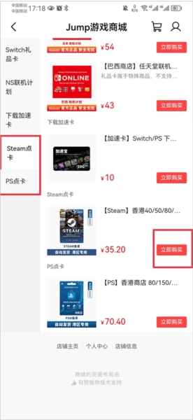 2、进入后,在左边分类中选择steam点卡或者ps点卡,然后点击立即购买