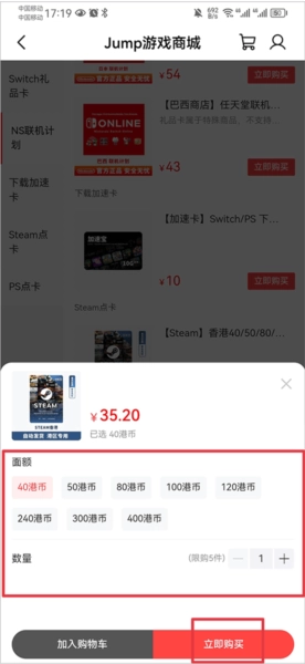 3、最后选择好购买的面额与数量,点击立即购买并完成订单支付,即可成功购买