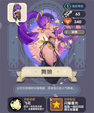 舞娘也算是个挺强力的职业,她能丢出一朵会随着移动变大的飞花,持续对敌人造成伤害。而且她的初始秘宝效果很厉害,能让角色进入无敌状态。到了后期怪物变多的时候,无敌时间就会显得格外关键。