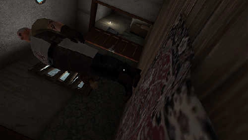 人物睁开眼睛后,先去正前方的抽屉里寻找线索,再从屏幕右侧的楼梯向上行进。