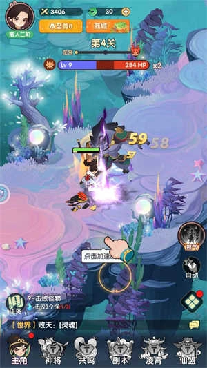 1、进入游戏后点击屏幕可以加快主角攻击,击败怪物可以获得灵力和各种奖励。