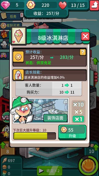 游戏的经营核心围绕店铺等级、生产线、运输线和店长这几个板块展开。其中店铺等级、生产线与运输线这三项,都能通过消耗金币提升等级,以此来优化经营效益;至于招募的店长,他们自身携带的技能同样可以为店铺收益带来额外加成。