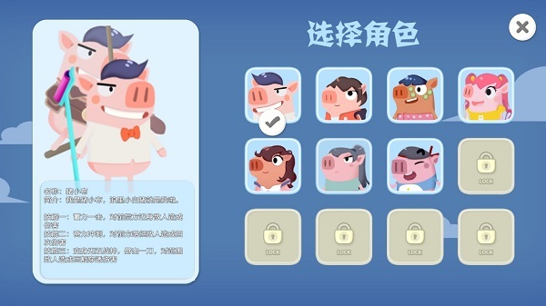 游戏里可供玩家挑选的角色总共有八位,它们分别是猪貂蝉、猪小布、猪小贤、猪一菲、猪益达、猪大力、猪咖喱和猪关谷。而关于这些角色的激活途径,想必会采用游戏币购买与付费充值相结合的双重模式。