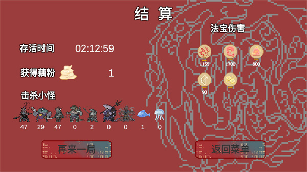 3、战斗设计为无尽挑战模式,玩家需持续消灭敌人、升级法宝,以应对不断变强的敌人,角色血量归零则闯关失败。