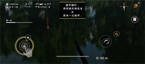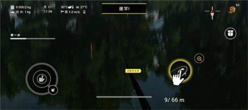 5、耐心等待就能让鱼儿上钩啦,浮标动的时候,可以点击右下角的放大键来放大浮标观察它的动向,手机振动就说明有鱼上钩了,钩子收晚了鱼会跑掉哦。