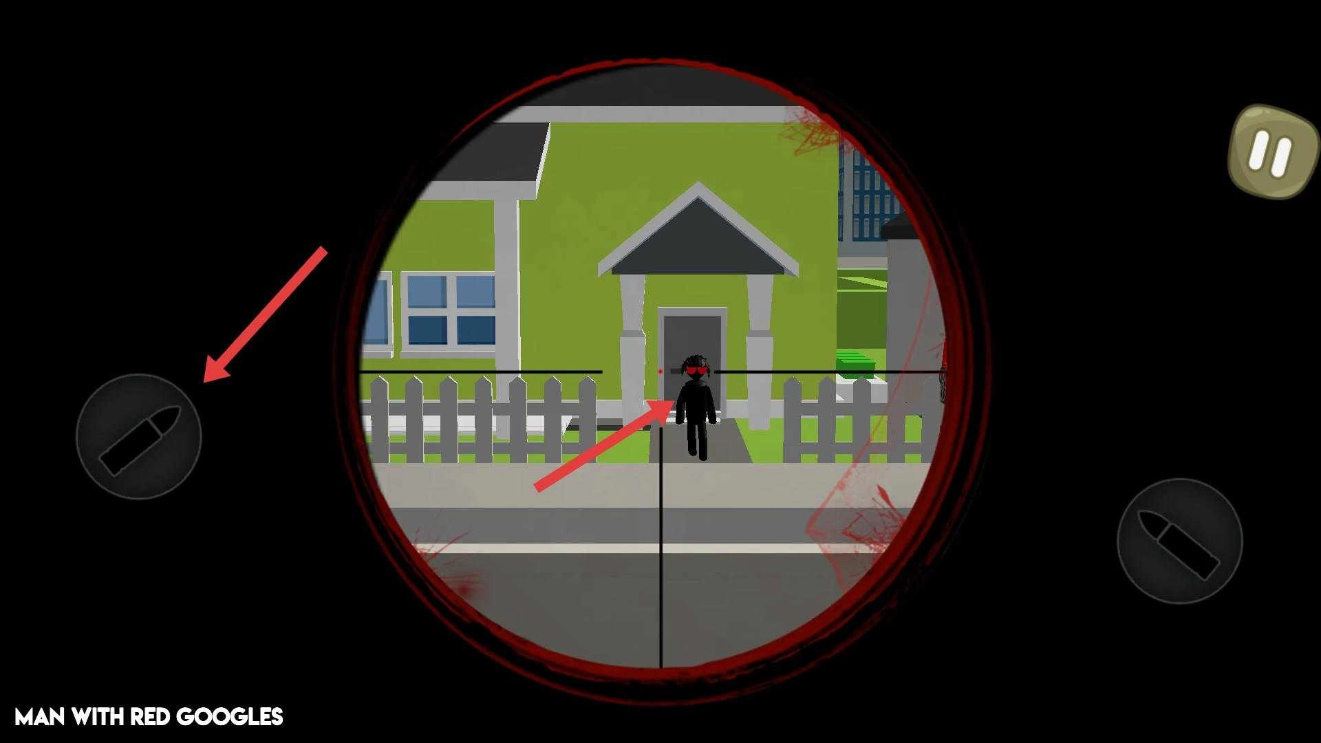 2、进入游戏后,通过狙击镜锁定目标,当发现佩戴红色护目镜的人物时,点击左侧的子弹按钮,即可发射子弹展开射击。