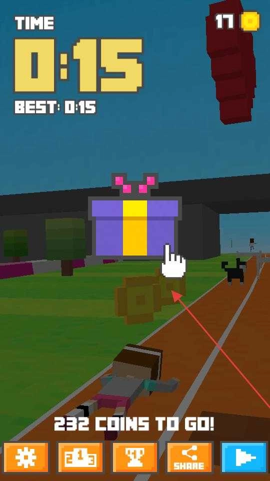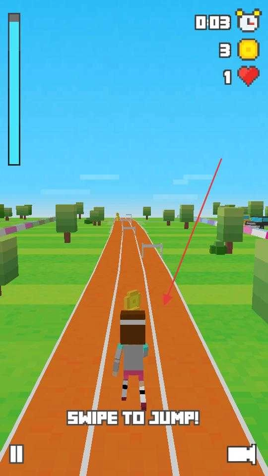 2、奔跑途中若碰到障碍物,就根据提示滑动屏幕使角色跃起,避开障碍物后继续往前跑,同时维持好角色的奔跑节奏,尽可能收集更多金币。