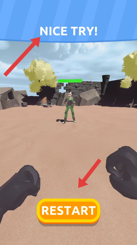 3、要是挑战没能成功,屏幕上会显示“NICE TRY”的提示语,提示下方设有“RESTART”按钮,点击该按钮就能重新开启这一关卡,再次向对手发起挑战,争取战胜对方。