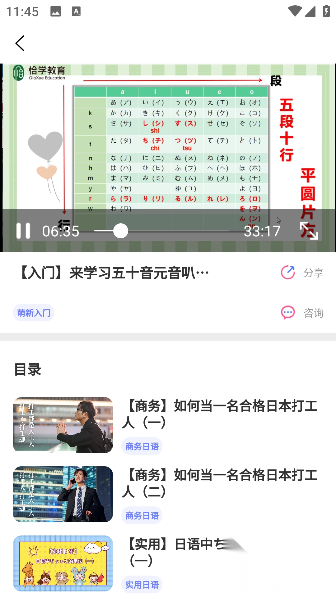 1、五十音图教学,包含真人发音示范和笔顺动画展示。