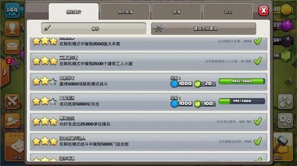 第三,成就,每达到一个杯段就相当于完成一个成就任务。系统都会给予一定的宝石做为奖励。尤其是达到1250杯的时候是直接得到 450宝石,这就可以直接买第三个农民了,并且完成其他成就也有不少的宝石奖励。所以任务一定要做!