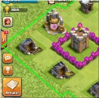 3、当你移动任何一个建筑或者城墙的时候,建筑周围(一格距离之外)会显示出一条白色的线。敌人只能在白线范围之外下兵。如果阵型里有一个3X3或者以上的空位的话会产生一个漏洞,敌人可以在这个漏洞里下兵。所以布阵之后需要检查一下,确保阵型里没有留下漏洞让敌人有机可乘.