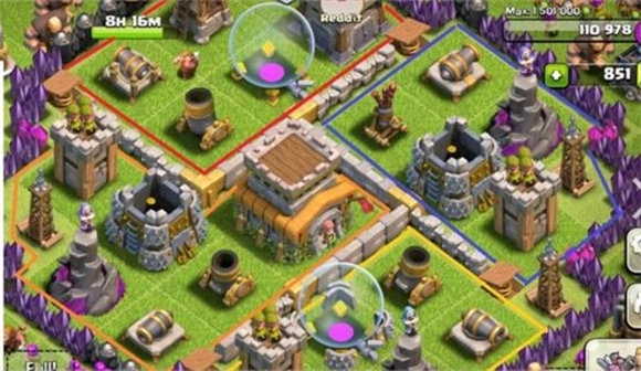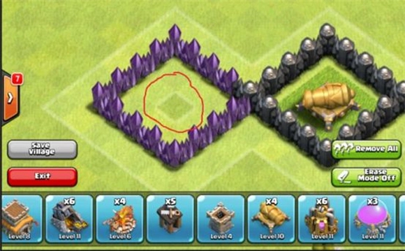 5、千万不要把所有的资源储存建筑集中放置在一起,所有鸡蛋放在一个篮子里的下场往往是被敌人轻易的拿走所有的资源。利用建筑和墙的摆放可以引导敌人的兵力,让他们聚集在一起被迫击炮和法师塔杀伤,或引导他们踩到陷阱而死伤惨重。