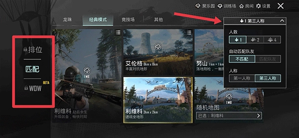 3、然后根据自己的喜好选择地图,点击右上角还可以选择单排、双排和四排