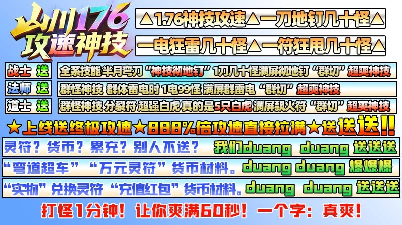 山川176攻速神技是一款畅快的复古传奇游戏。简单挂机冒险,自动回收装备,玩家无需费心就能在传奇热血世界里尽情畅游。超高爆率让散人玩家打金更具乐趣,支持武器自由交易,轻松获取百万元宝。各种挑战活动不定时开启,为玩家提供丰富的挑战机会,让大家在战斗中不断提升自身能力,在冒险中持续变得强大。