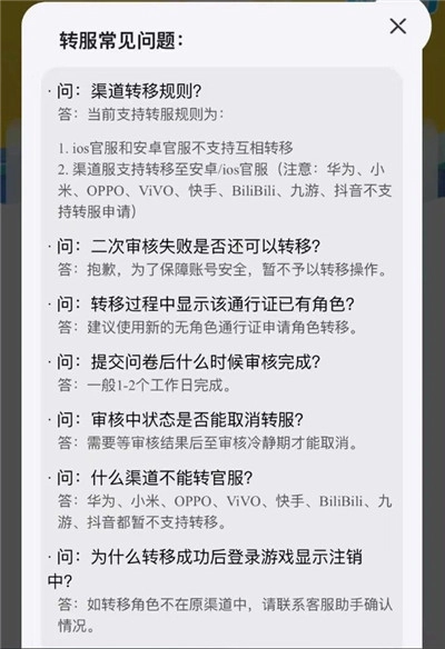2、渠道服转安官/ios官服,转移规则,iOS官服和安卓官服不支持互相转移,渠道服支持转移至安卓/iOS官服,目前只支持部分小渠转移