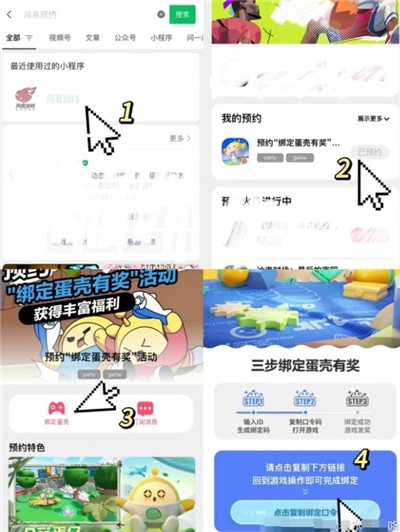 6、转移操作步骤如下:点击绿色箭头指向的“wy预约”入口,进入页面后找到“蛋仔”选项,点击“预约”按钮,接着输入ID并完成绑定,之后再填写“转移申请”即可。