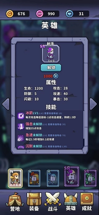 主界面点击英雄可查看所有英雄(目前已开放了5个英雄,会不断增加),每个英雄有不同的品质、属性和技能。