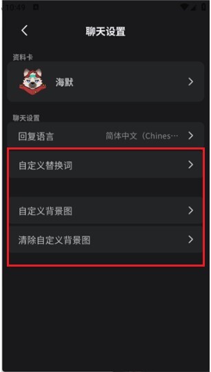 5、然后还可通过右上角菜单,设置语言、替换词及背景图,定制专属聊天体验。