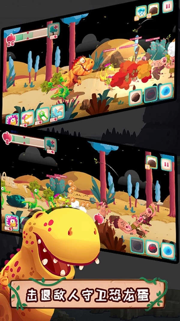 2、在此过程中,控制各种恐龙以阻止敌人的攻击,消灭所有敌人并保护您的宝宝;