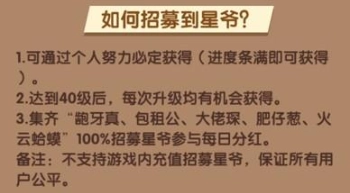 要获得分红,用户得招募到星爷——这可是疯狂收租婆升级的最高等级。招募星爷的途径,除了升级之外,还能靠个人努力达成:每个用户都有对应的进度条,等进度条填满就能拿到星爷。至于其他获取方式,都只是有概率能得到而已。所以咱们还是得好好玩游戏或者去推广,不然也很难满足分红的要求。
