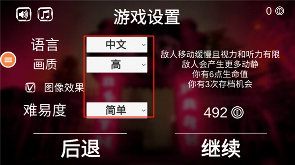 2、进入游戏设置界面,对语言、画质、难易度等选项进行设置后,选择“继续”按钮。