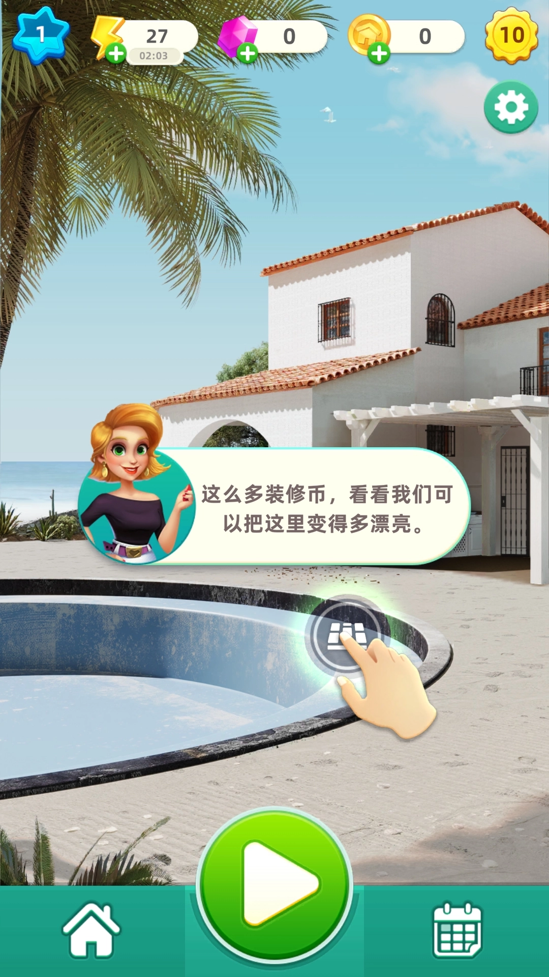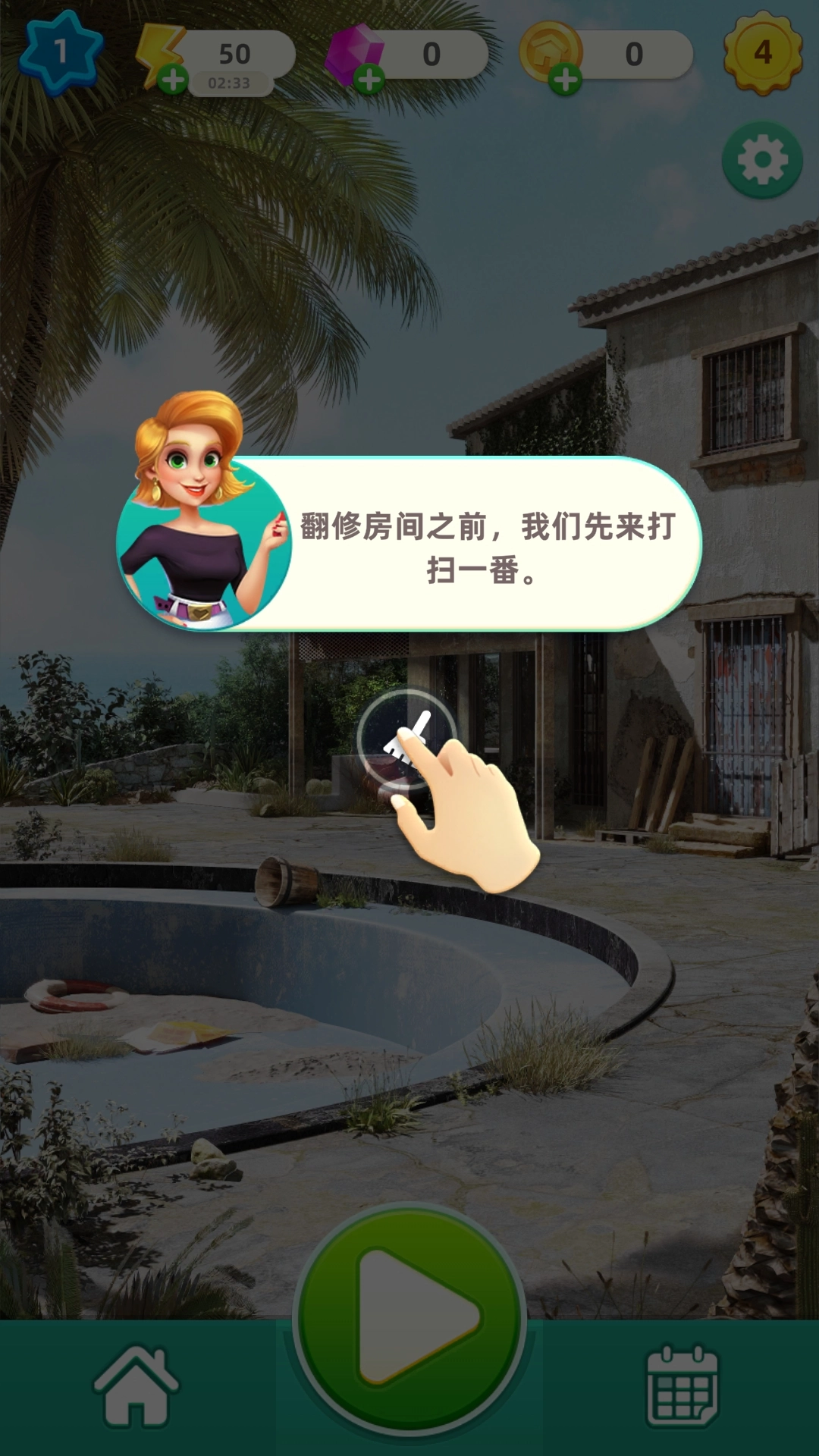 2、我们可以跟随系统的引导进行别墅的打扫和翻新,点击【扫把】图标,
