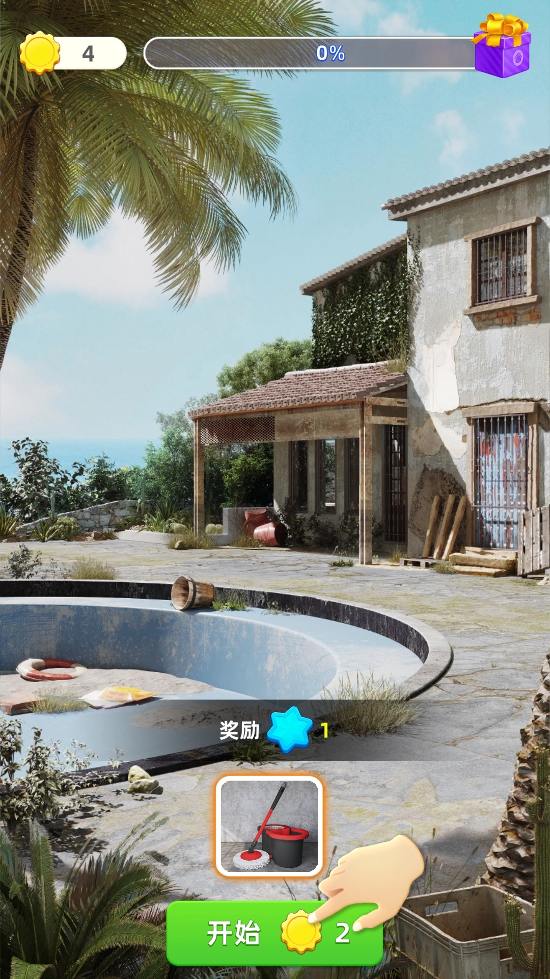 3、每次打扫和翻新都需要消耗金币,我们点击下方的【开始】选项,