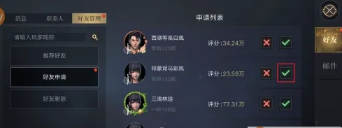 右边的列表中会显示可添加的好友,玩家只需点击勾选按钮即可通过好友申请。