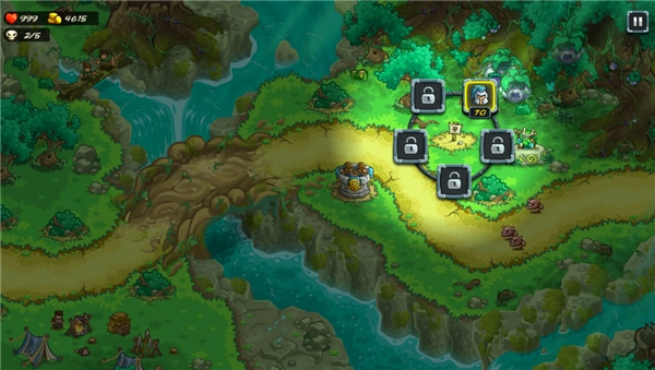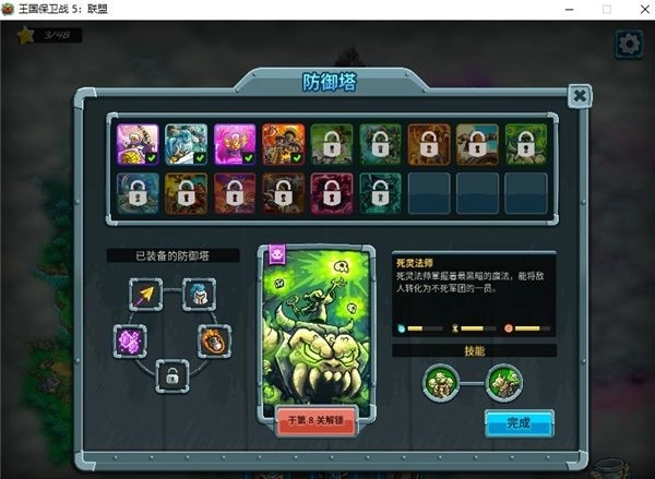 需要注意的是,第三张地图不太建议用岩浆坑和死灵法师来拦截敌人。岩浆坑召唤恶魔和眼精时随机性高,而眼精又很灵活,两者碰到一起往往容易让人心态失衡;死灵法师召唤骷髅的速度则太慢了。比较推荐的搭配是:用大树作为主要的拦截塔,死灵法师作为辅助塔兼顾法术输出,哥布林哨兵塔则用来应对后期关卡里的大型怪物。