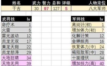 这位角色的定位相当高,身为八大军师之一,掌握增技高的仅有6人,武将技里的三大核心技能他占了两个,命疗术和炎龙系都是实用性极强的技能。可惜他的武力值仅30点,又没有伏兵技能,这直接让他的个人战力大打折扣,大大降低了他的综合价值。通常情况下,他更多被当作增技高的军师来辅助团队;若非要让他上阵作战,就必须带兵才行。对于这类低武力且无伏兵的武将,推荐搭配飞刀兵,依靠精准的控兵操作和自身的武将技来克敌制胜,玩家间常说“满兵时能横着走,没兵时连狗都不如”。