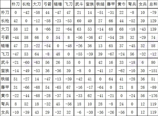 一般来说,长兵器克制短兵器,短兵器克制弓,弓则克制长兵器。长兵器的主要种类有长枪、大刀、链锤、铁缒;短兵器主要包含朴刀、武斗、蛮族、藤甲、女兵;弓类主要有弓箭、弩兵、飞刀。