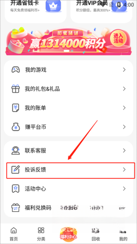 2、在“我的”中找到“投诉反馈”功能。