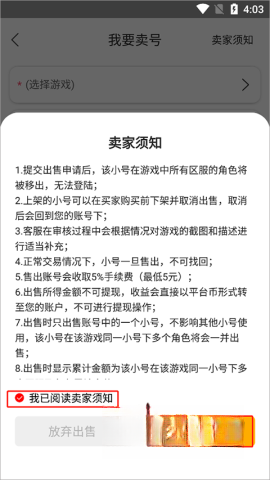 3、需要同意“卖家须知”,然后点击“确定出售”。